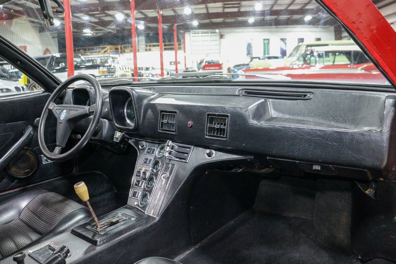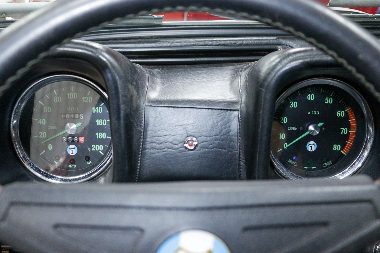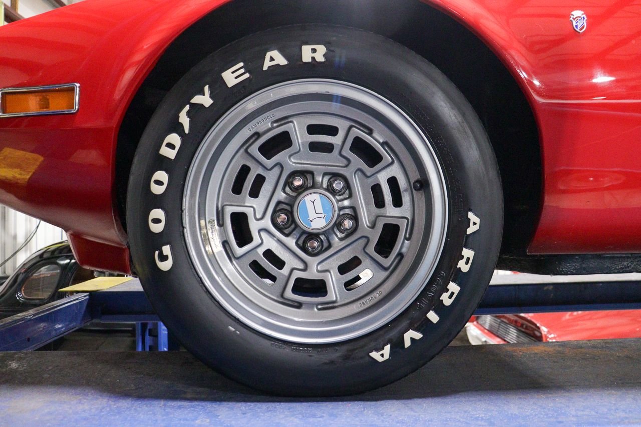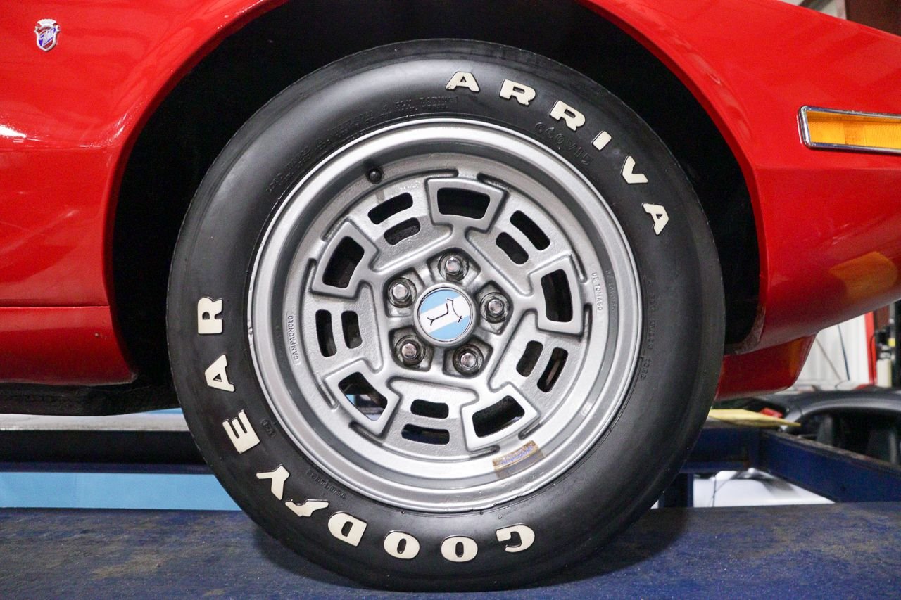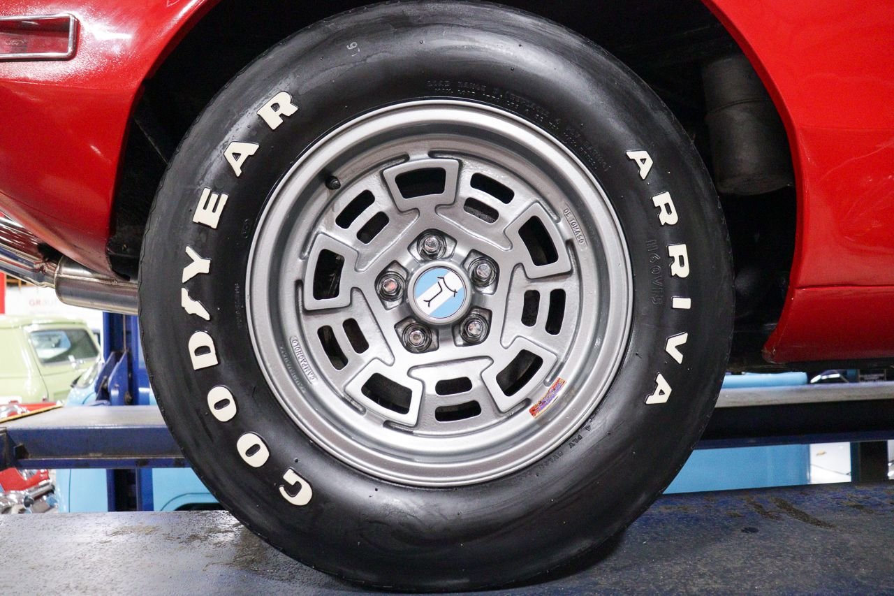 The exterior of this Pantera is painted in a striking red color with the original wheels and appropriate Goodyear tires completing the exterior look. Needless to say this is a beautiful car. It was designed by the Italian design firm Ghia’s American-born designer Tom Tjaarda. Unlike the De Tomaso Mangusta before it, the Pantera used a steel monocoque design.