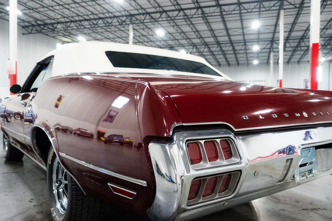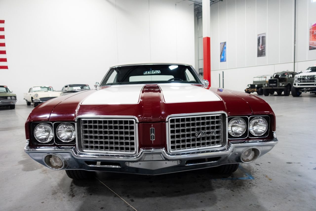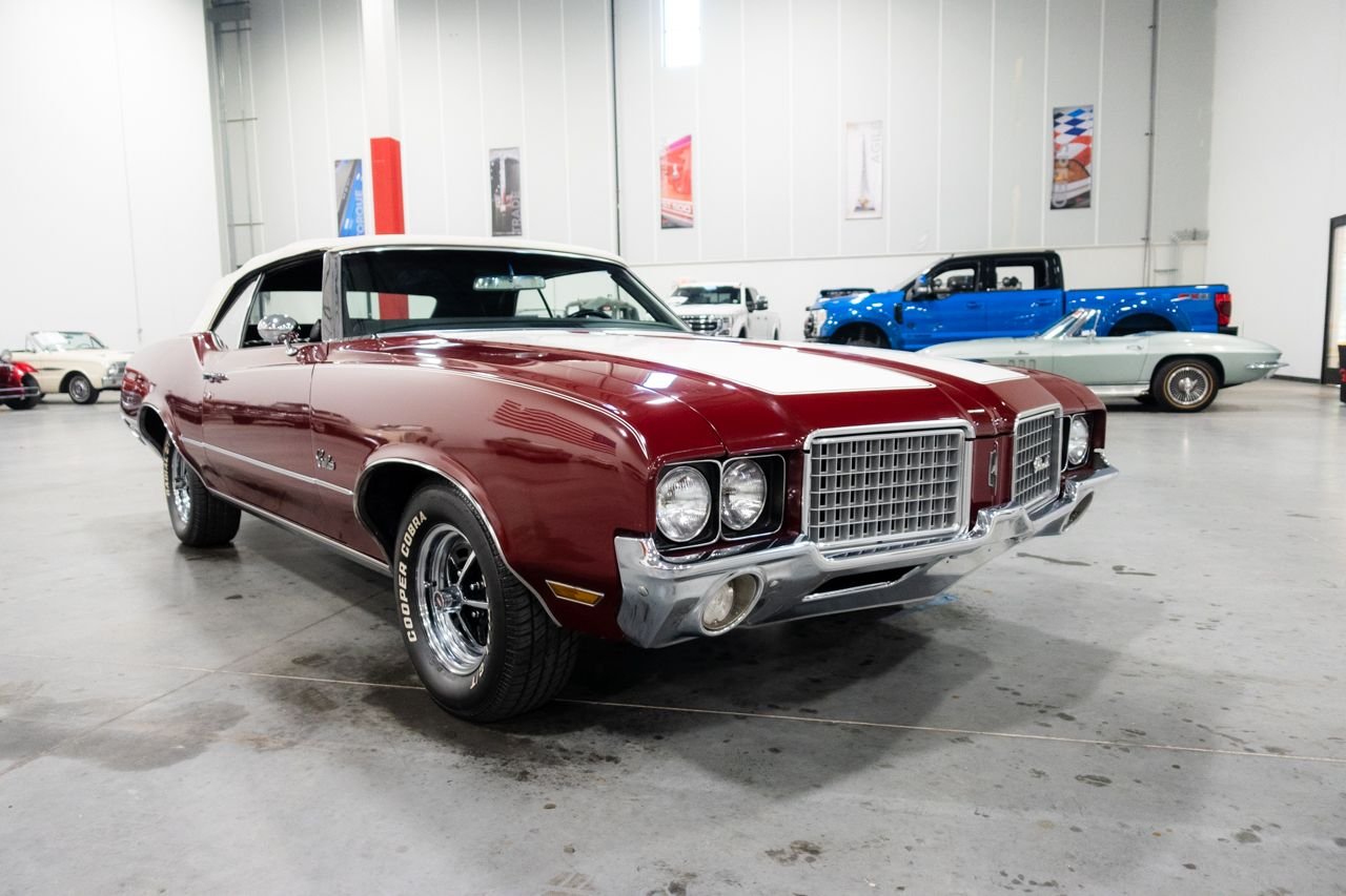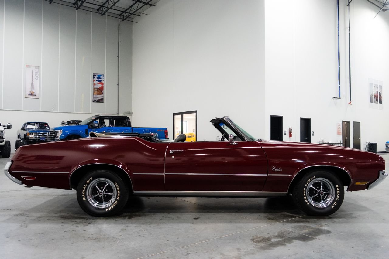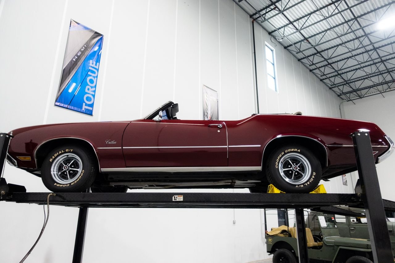 1972 Oldsmobile Cutlass convertible for consideration. This well restored and strong running Cutlass convertible is very clean and shows beautifully. The car is finished in Matador Red with a beautiful black interior. The electric top is in great condition and functions flawlessly. Powering this classic is a Rocket 350 with a 4-barrel carburetor mated to an automatic transmission. The car features power steering, AC, sport mirrors, power brakes, Sherwood AM/FM radio, Magnum wheels, and a custom spare tire cover. Don’t miss out on this beautiful classic, they don’t get any better! Drive this one out of our showroom or have us assist you with shipping anywhere within the United States!
