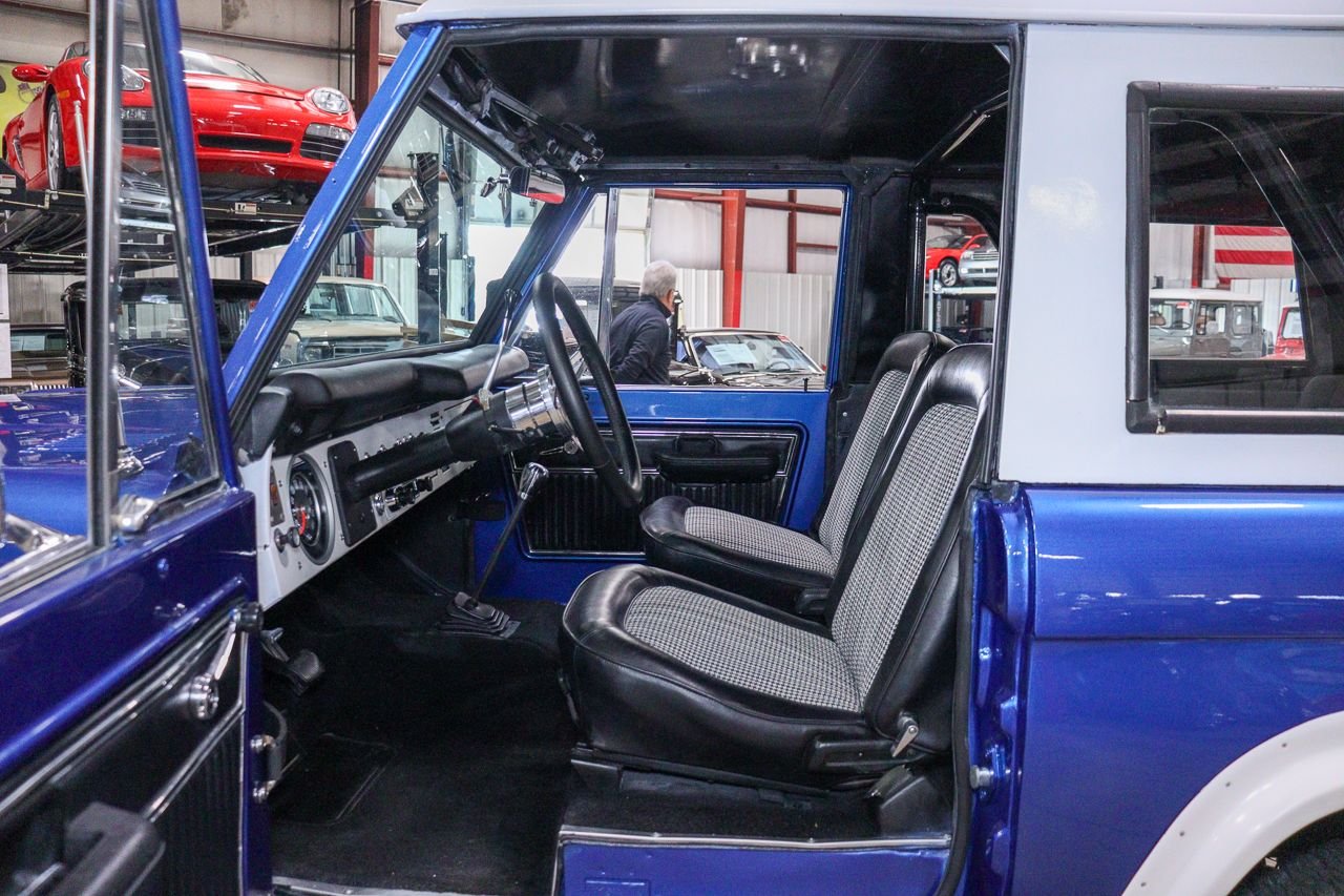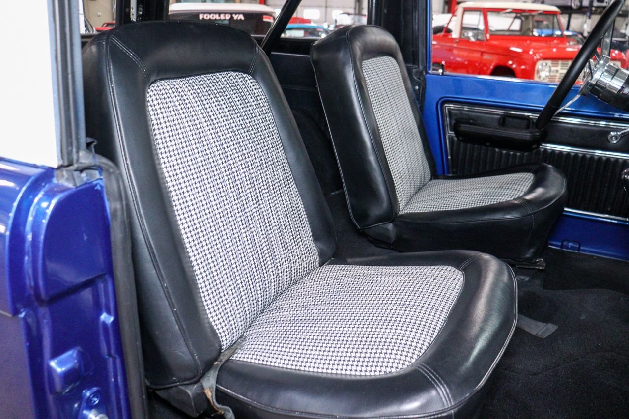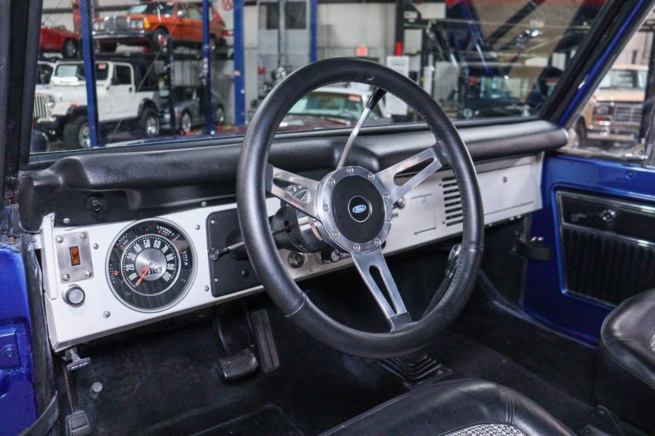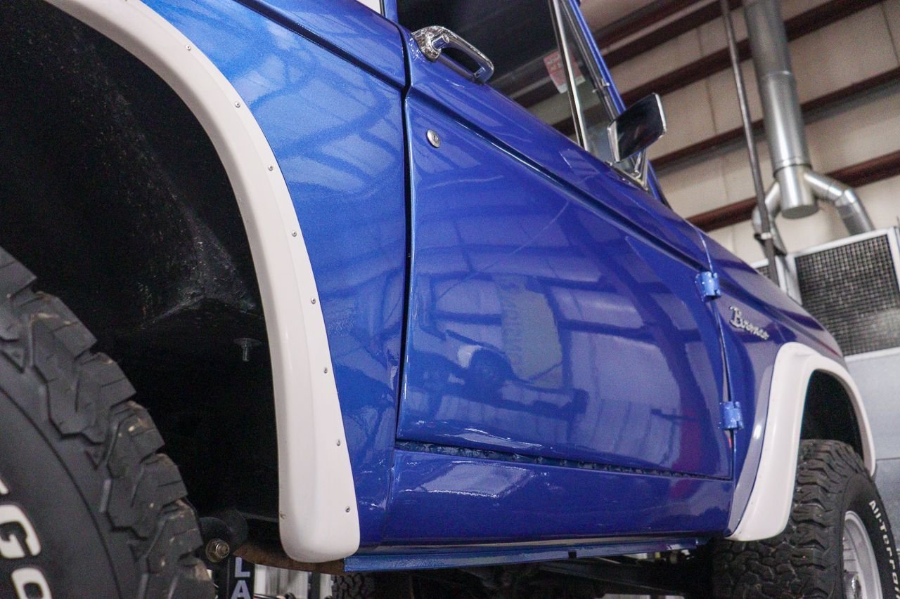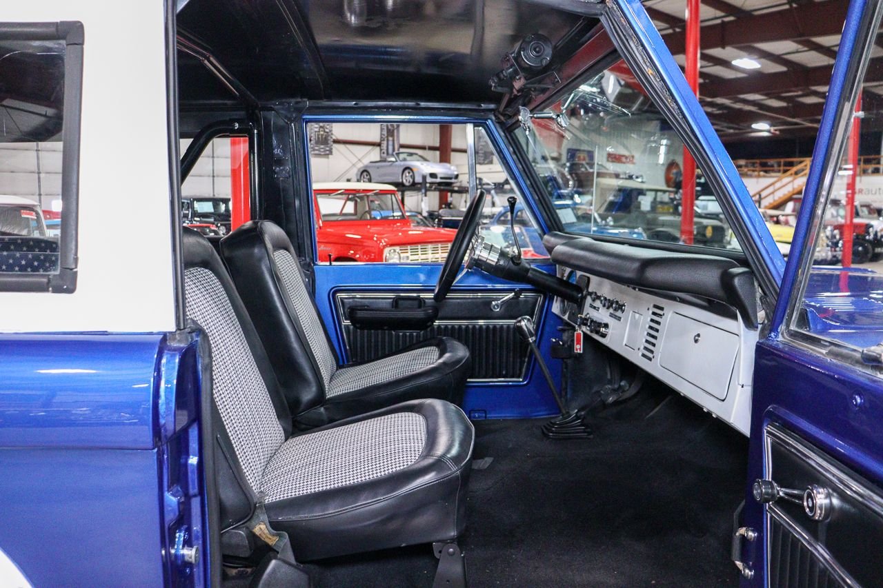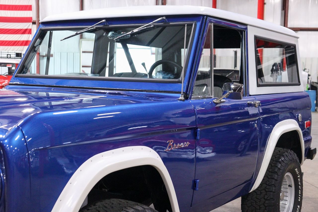 1974 Ford Bronco in excellent condition, boasting a powerful V8 motor and smooth automatic transmission. This classic SUV has undergone a minor restoration, including a fresh blue metallic paint job that gleams in the sunlight. The interior is a tasteful black and white houndstooth design, adding a touch of vintage charm to the vehicle.