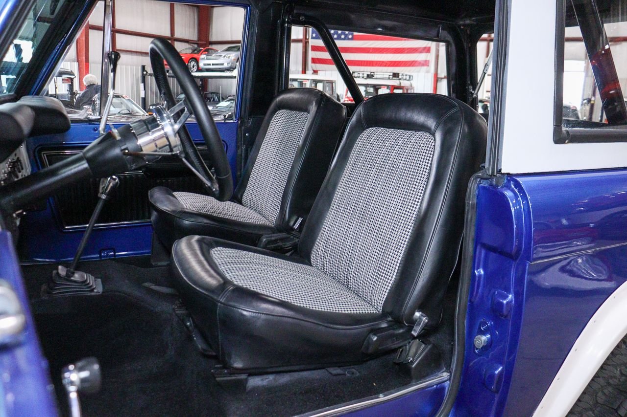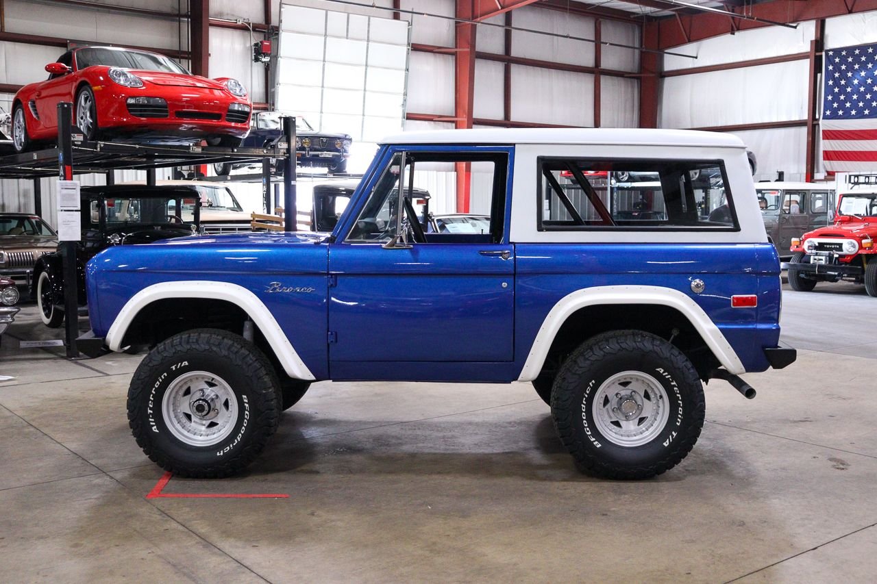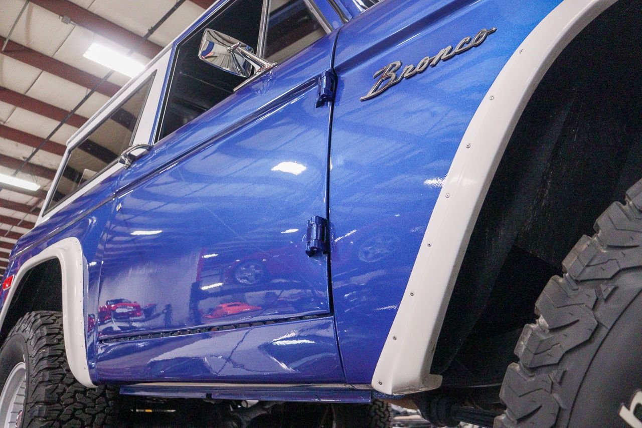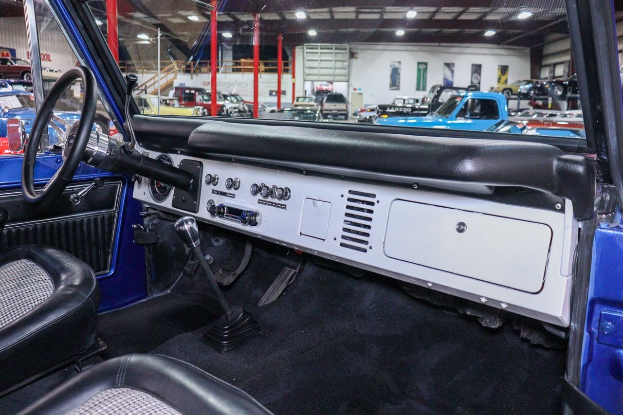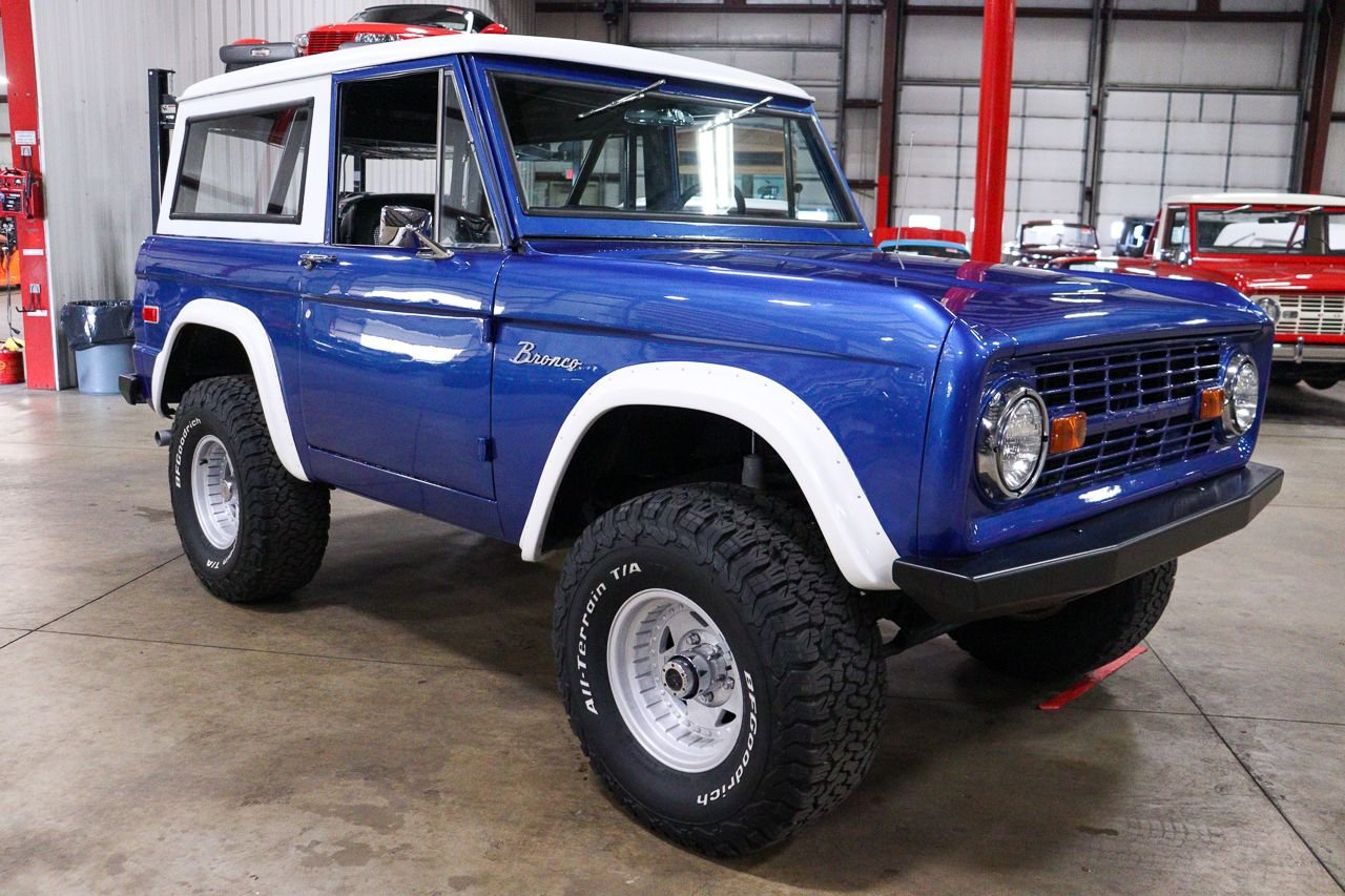 1974 Ford Bronco in excellent condition, boasting a powerful V8 motor and smooth automatic transmission. This classic SUV has undergone a minor restoration, including a fresh blue metallic paint job that gleams in the sunlight. The interior is a tasteful black and white houndstooth design, adding a touch of vintage charm to the vehicle.