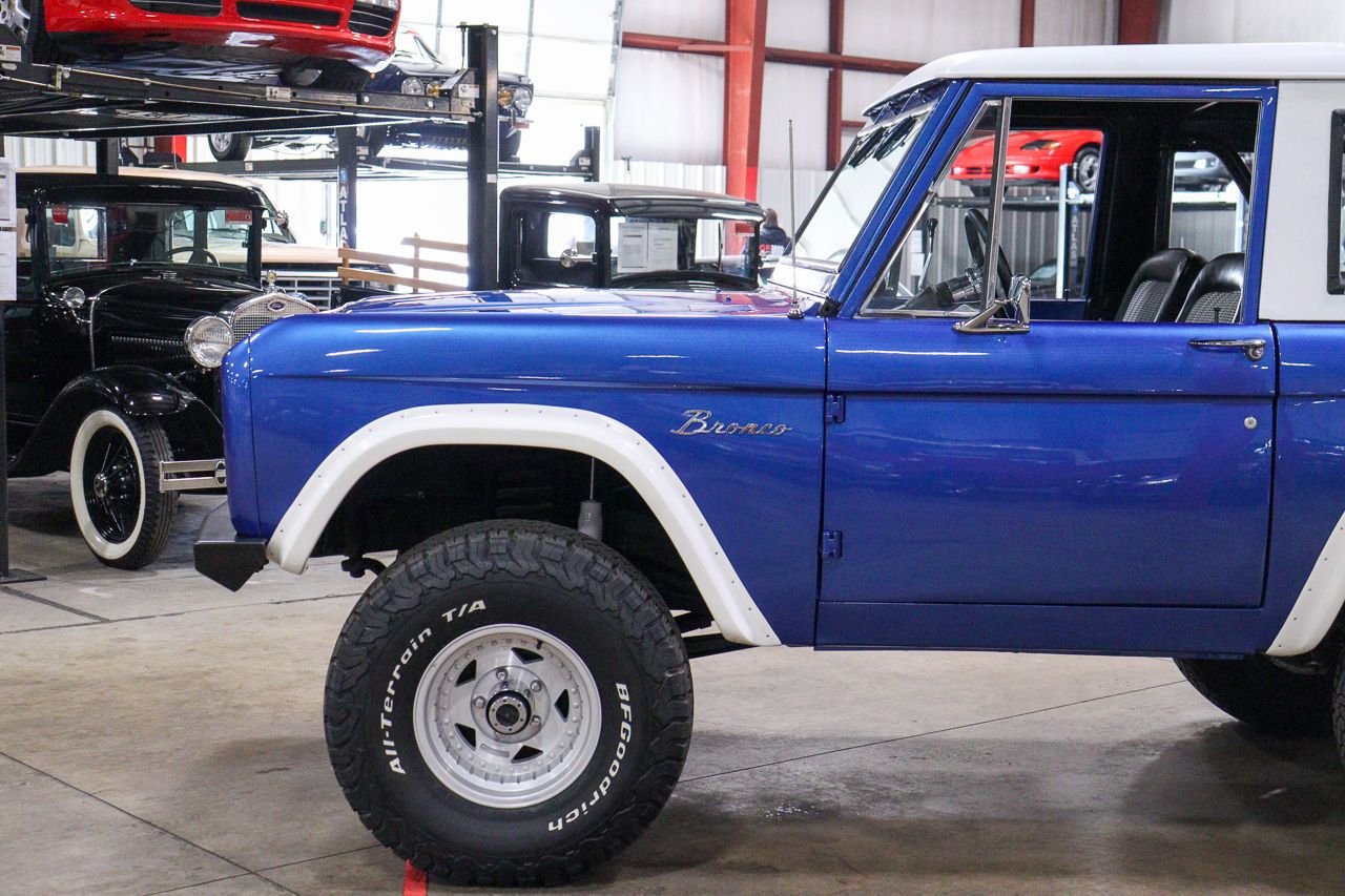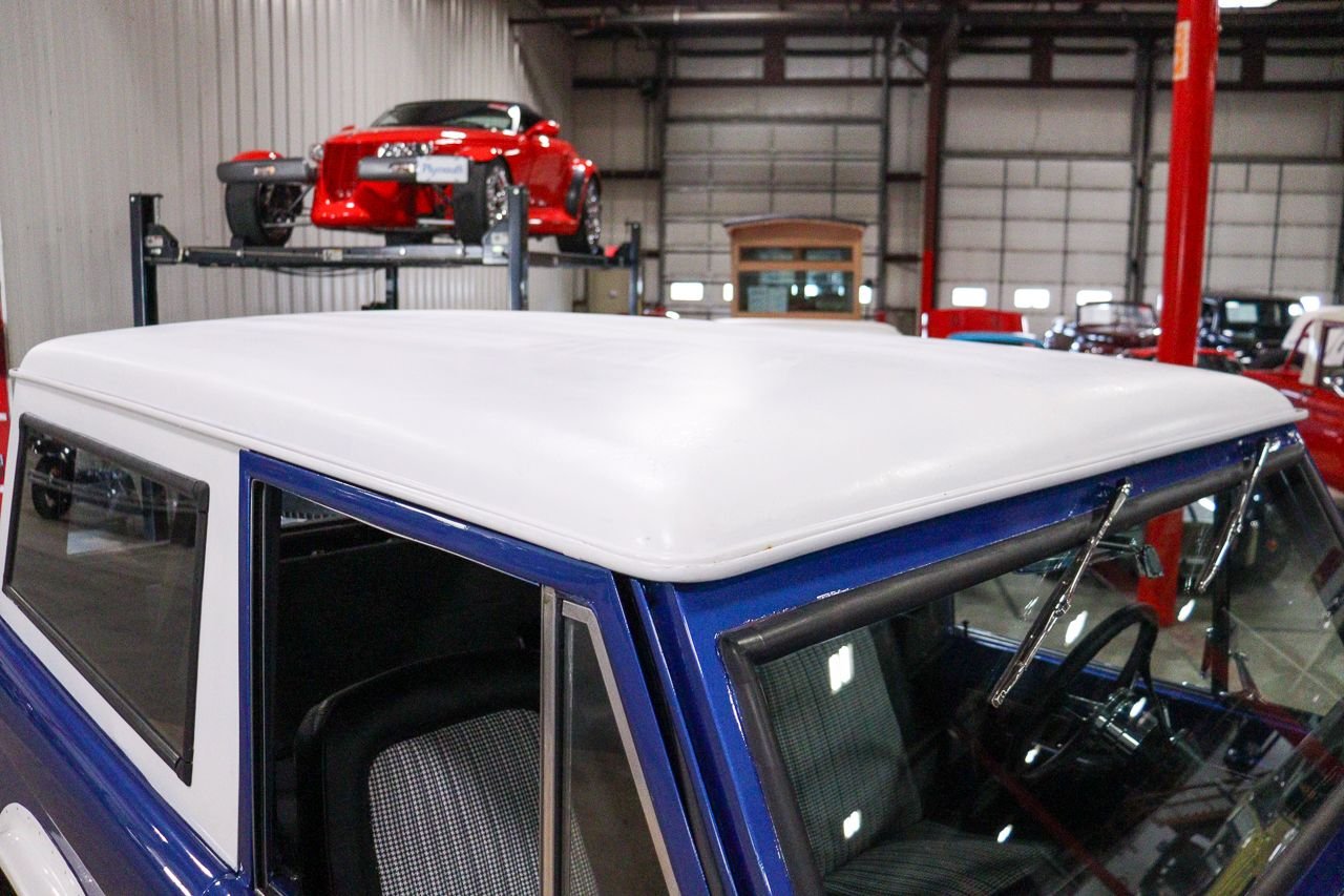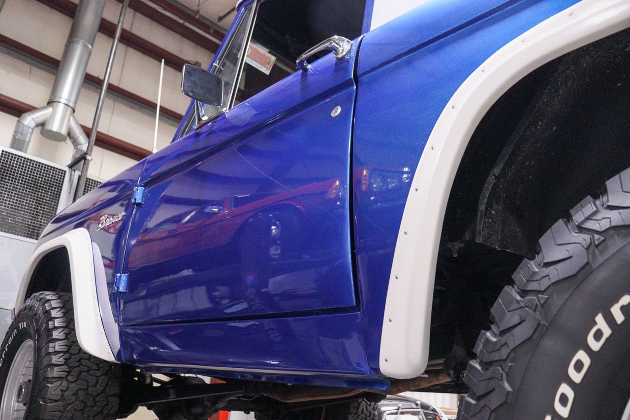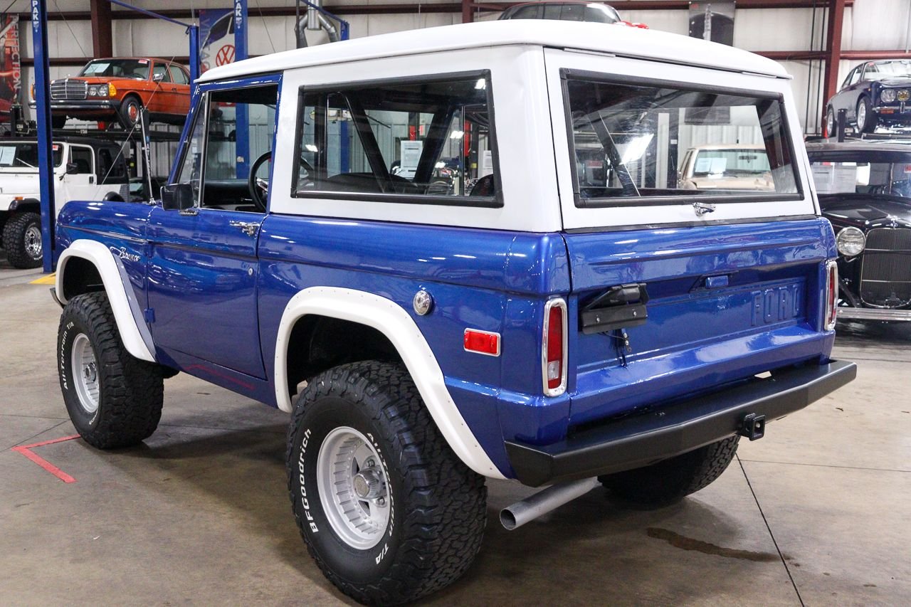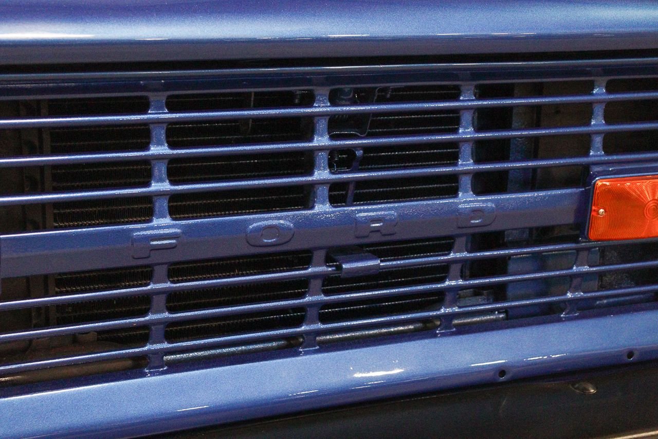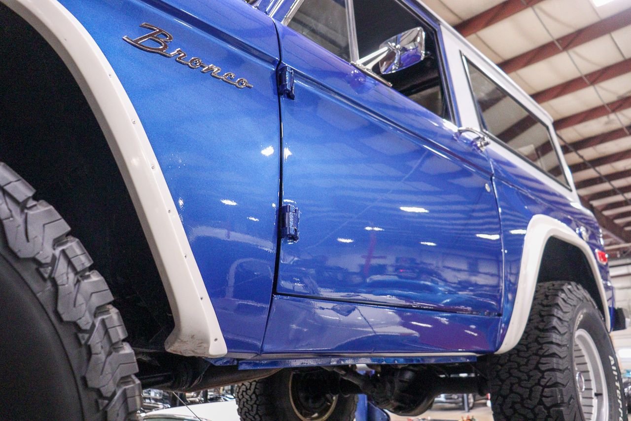 1974 Ford Bronco in excellent condition, boasting a powerful V8 motor and smooth automatic transmission. This classic SUV has undergone a minor restoration, including a fresh blue metallic paint job that gleams in the sunlight. The interior is a tasteful black and white houndstooth design, adding a touch of vintage charm to the vehicle.