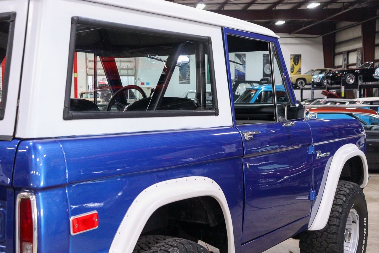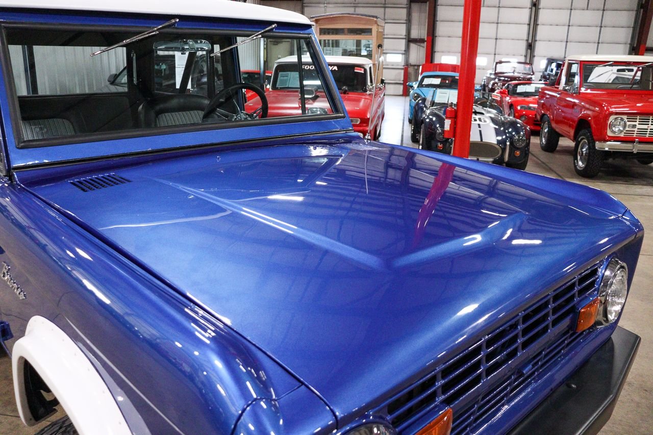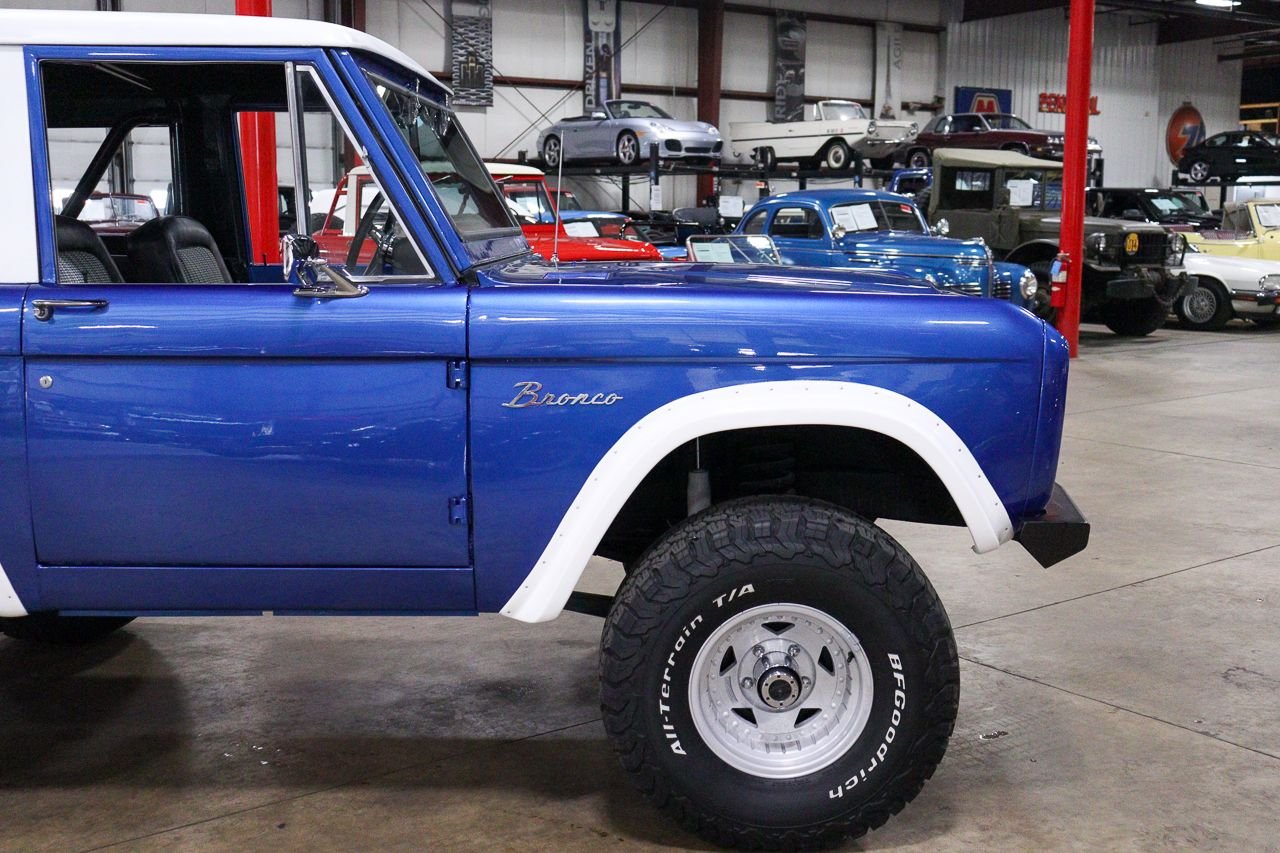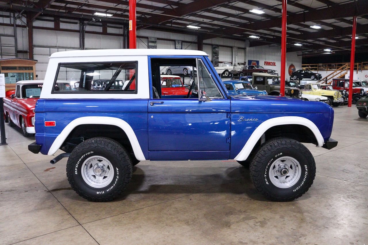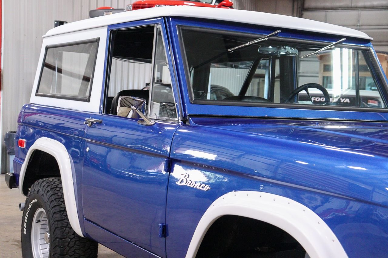 1974 Ford Bronco in excellent condition, boasting a powerful V8 motor and smooth automatic transmission. This classic SUV has undergone a minor restoration, including a fresh blue metallic paint job that gleams in the sunlight. The interior is a tasteful black and white houndstooth design, adding a touch of vintage charm to the vehicle.
