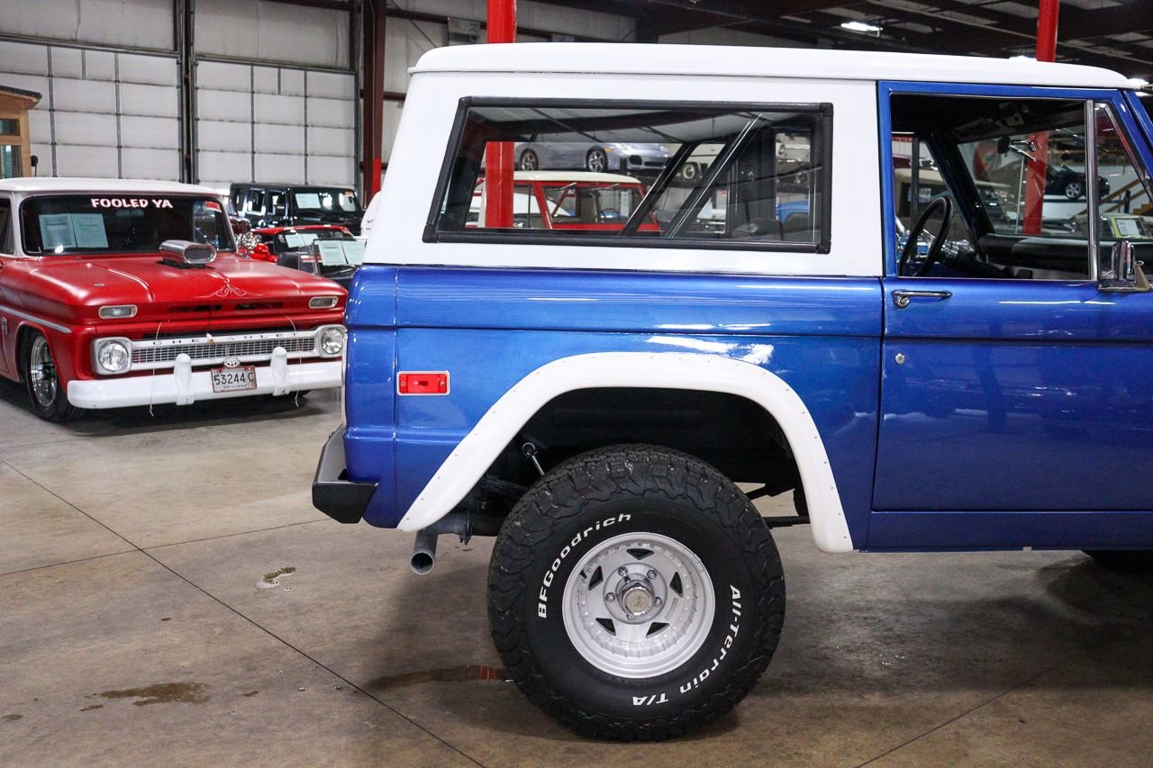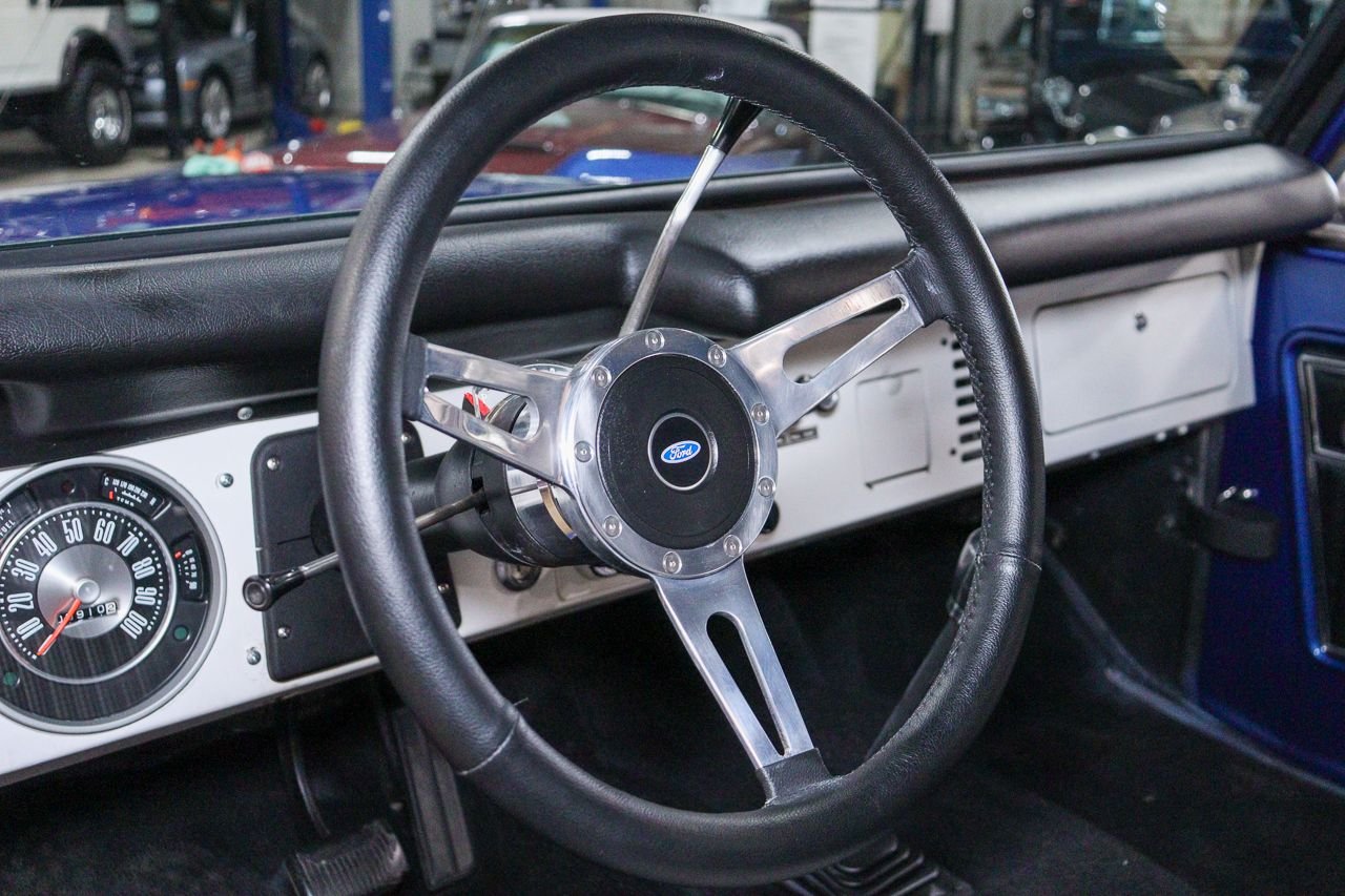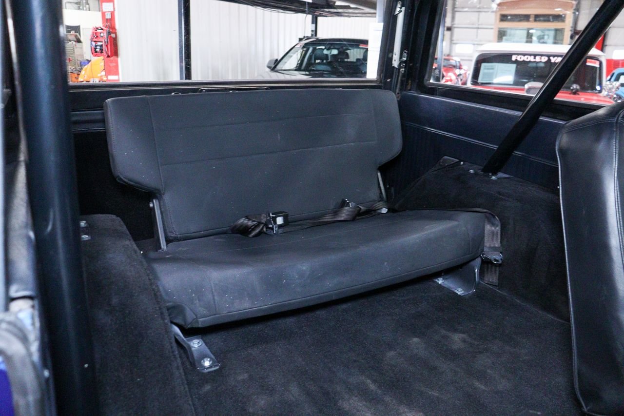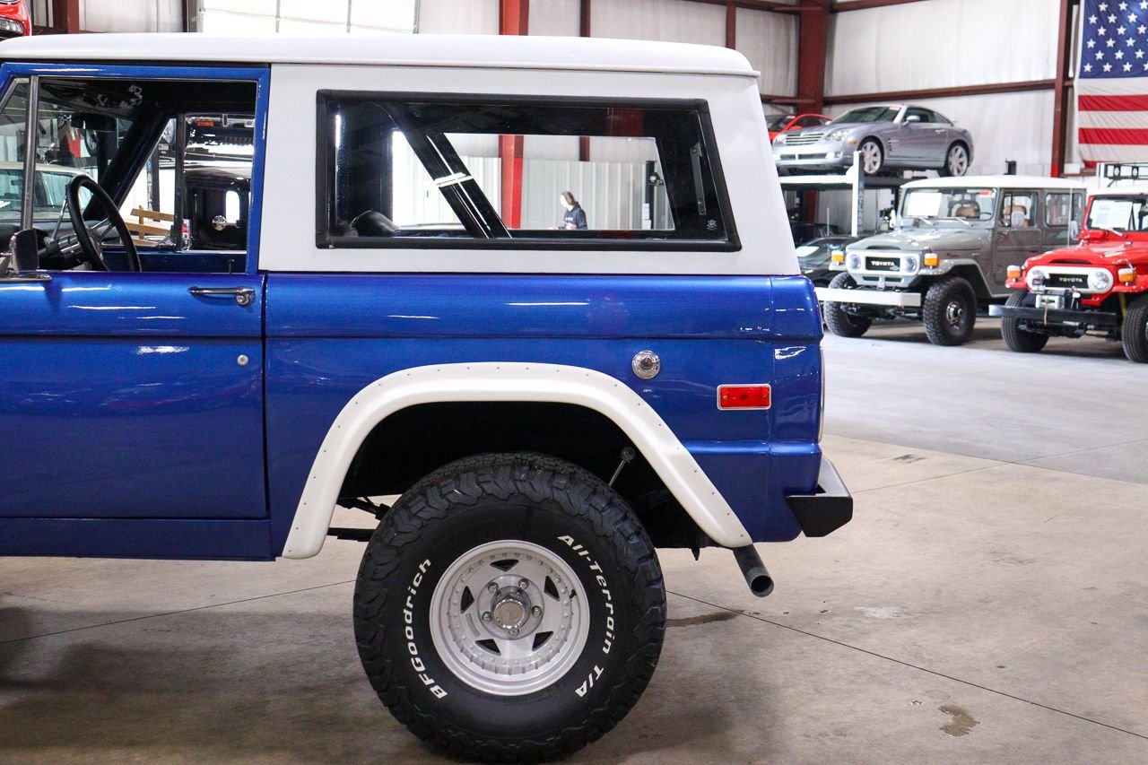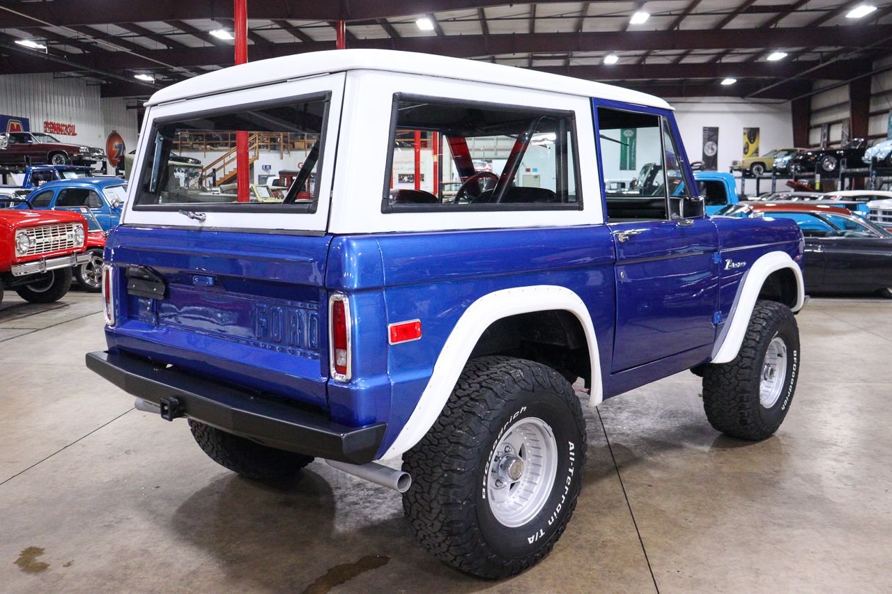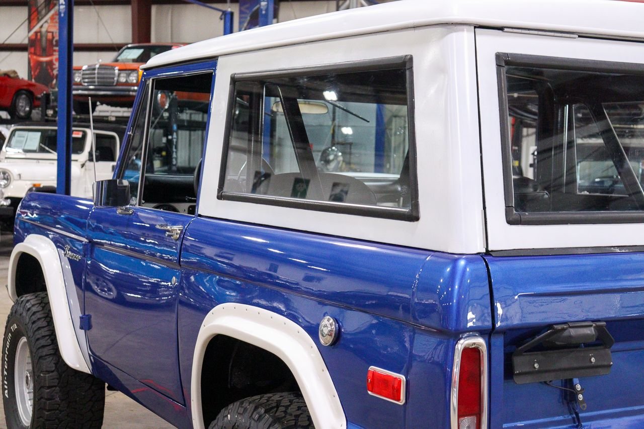 1974 Ford Bronco in excellent condition, boasting a powerful V8 motor and smooth automatic transmission. This classic SUV has undergone a minor restoration, including a fresh blue metallic paint job that gleams in the sunlight. The interior is a tasteful black and white houndstooth design, adding a touch of vintage charm to the vehicle.