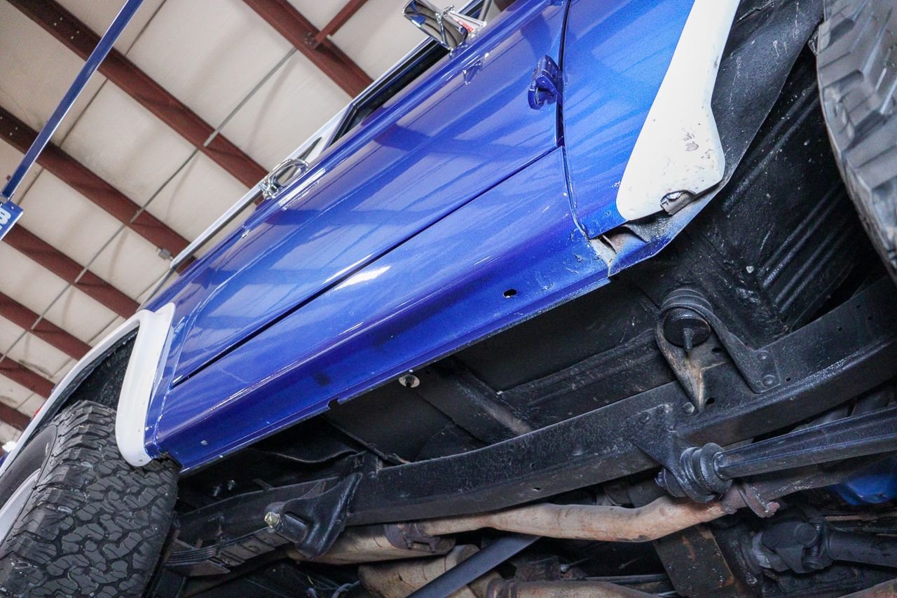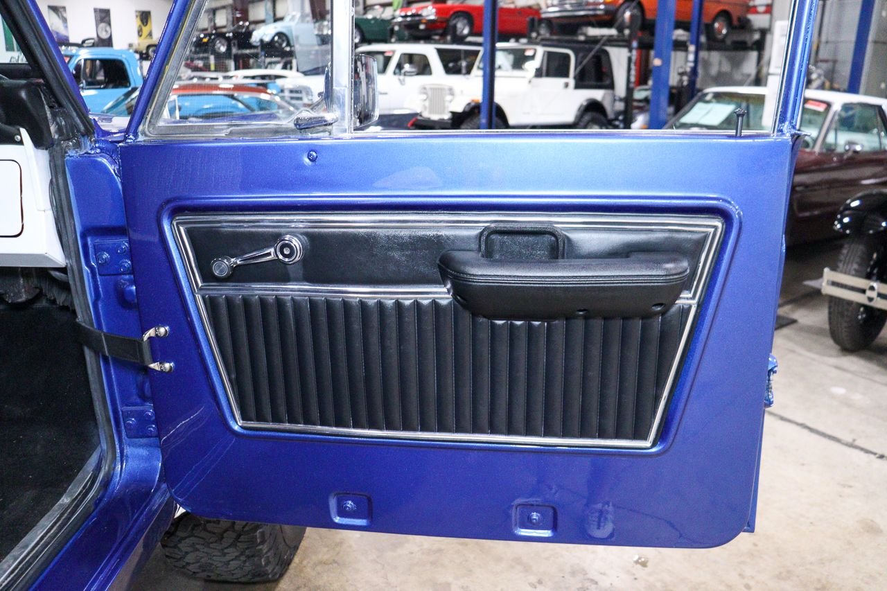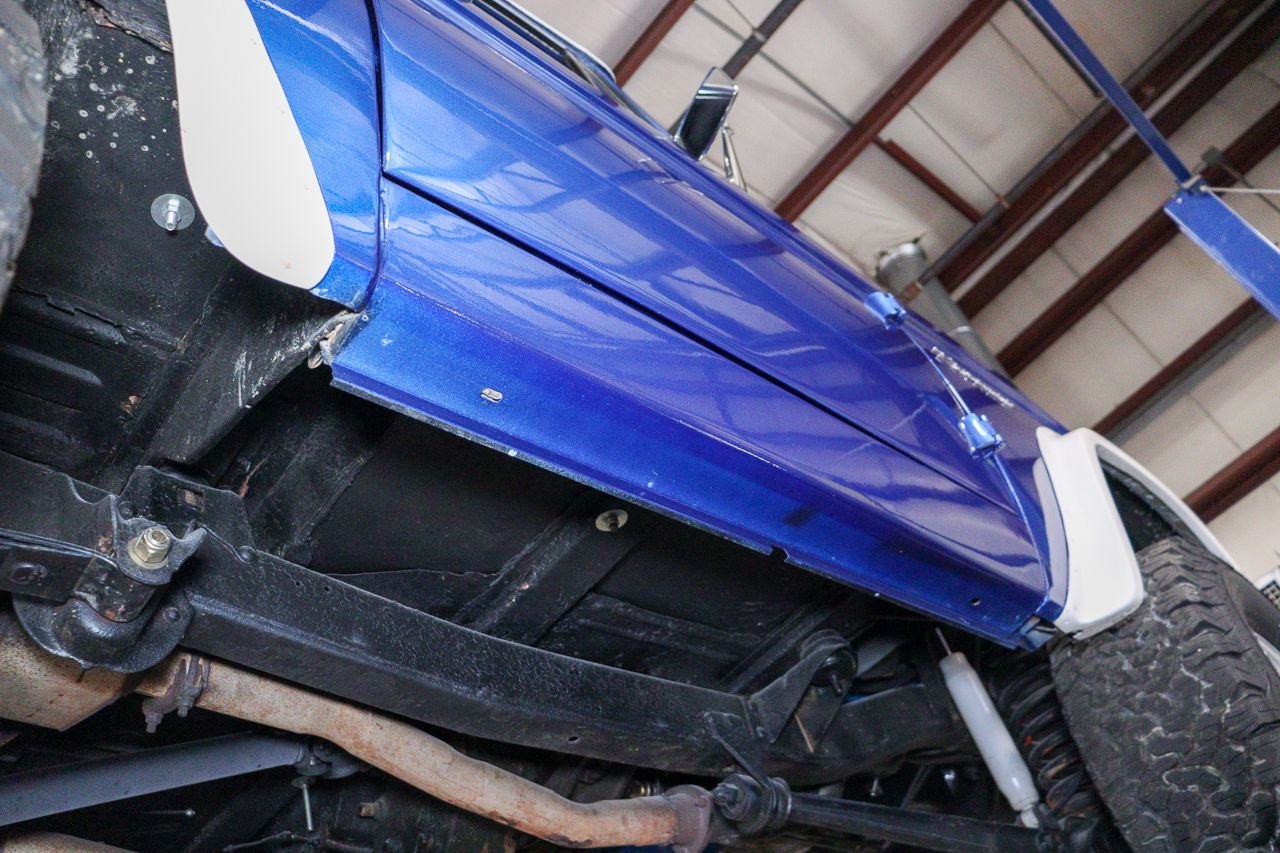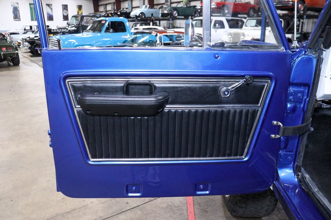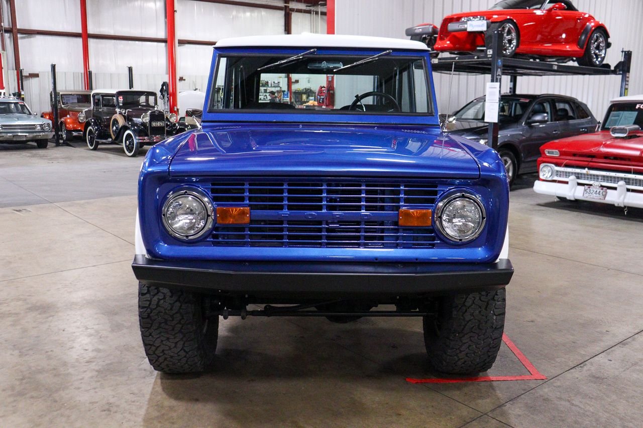 1974 Ford Bronco in excellent condition, boasting a powerful V8 motor and smooth automatic transmission. This classic SUV has undergone a minor restoration, including a fresh blue metallic paint job that gleams in the sunlight. The interior is a tasteful black and white houndstooth design, adding a touch of vintage charm to the vehicle.