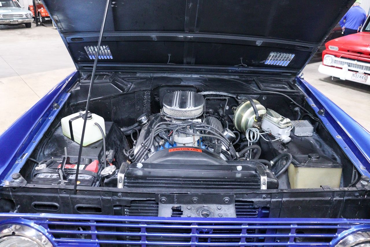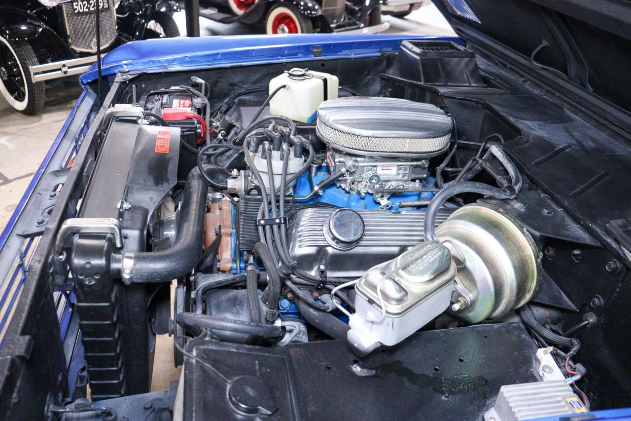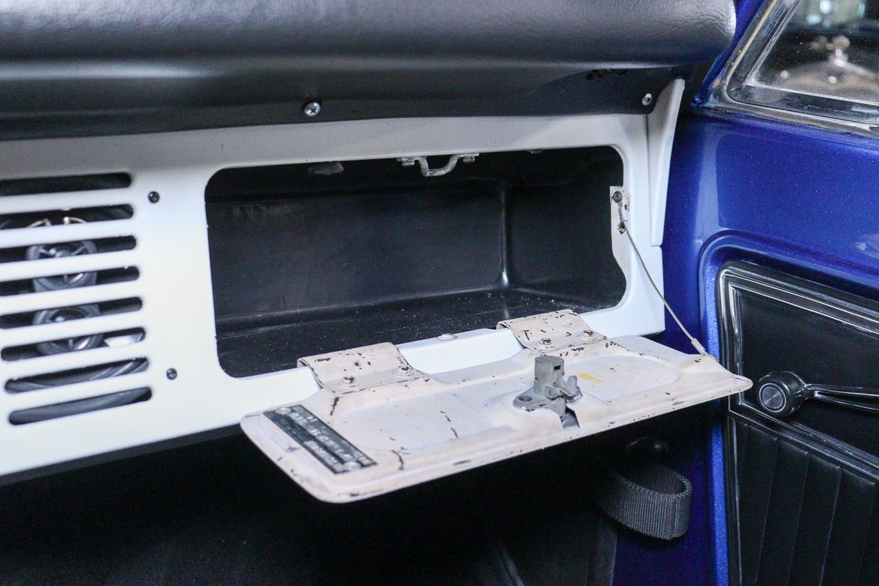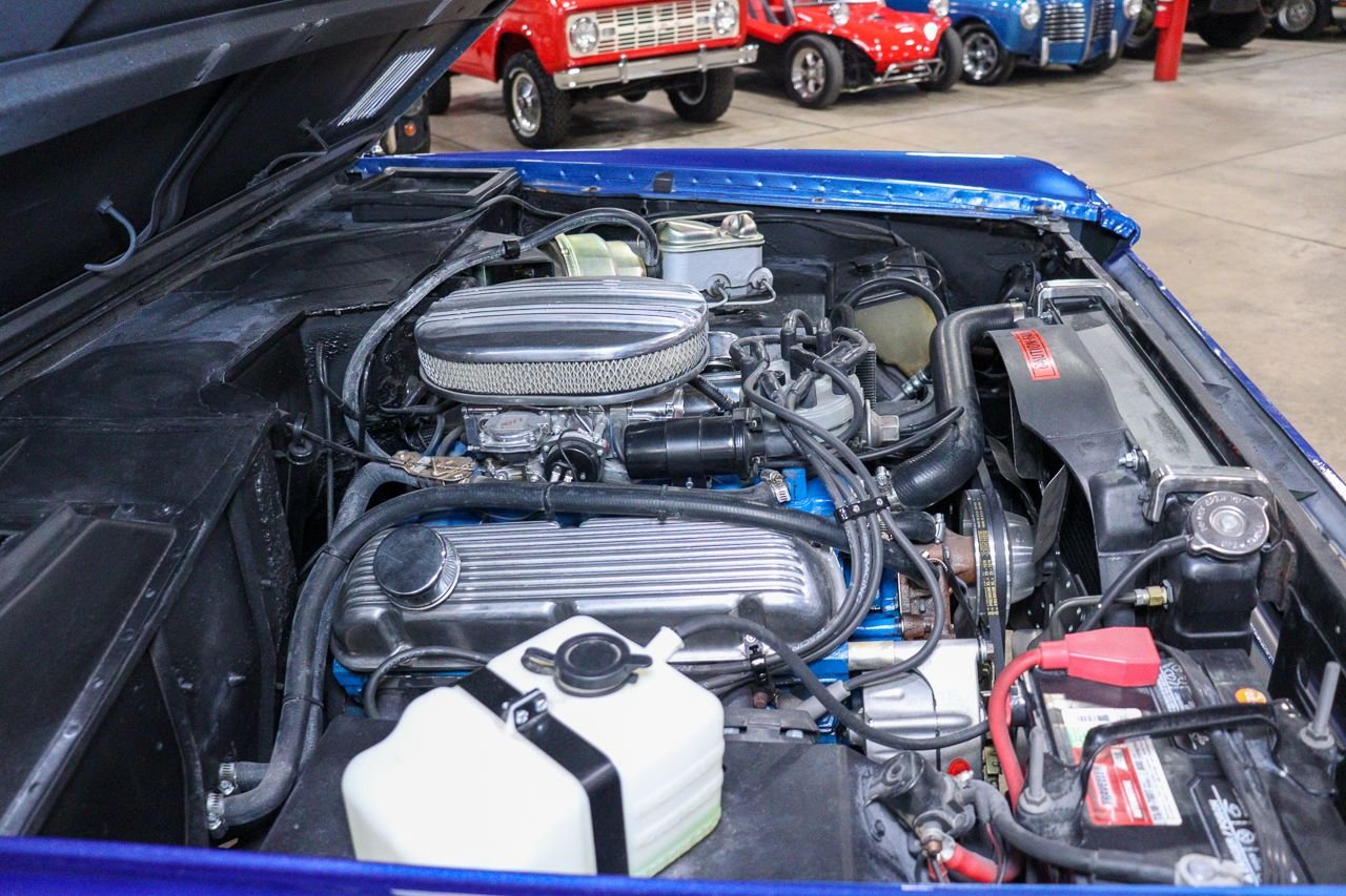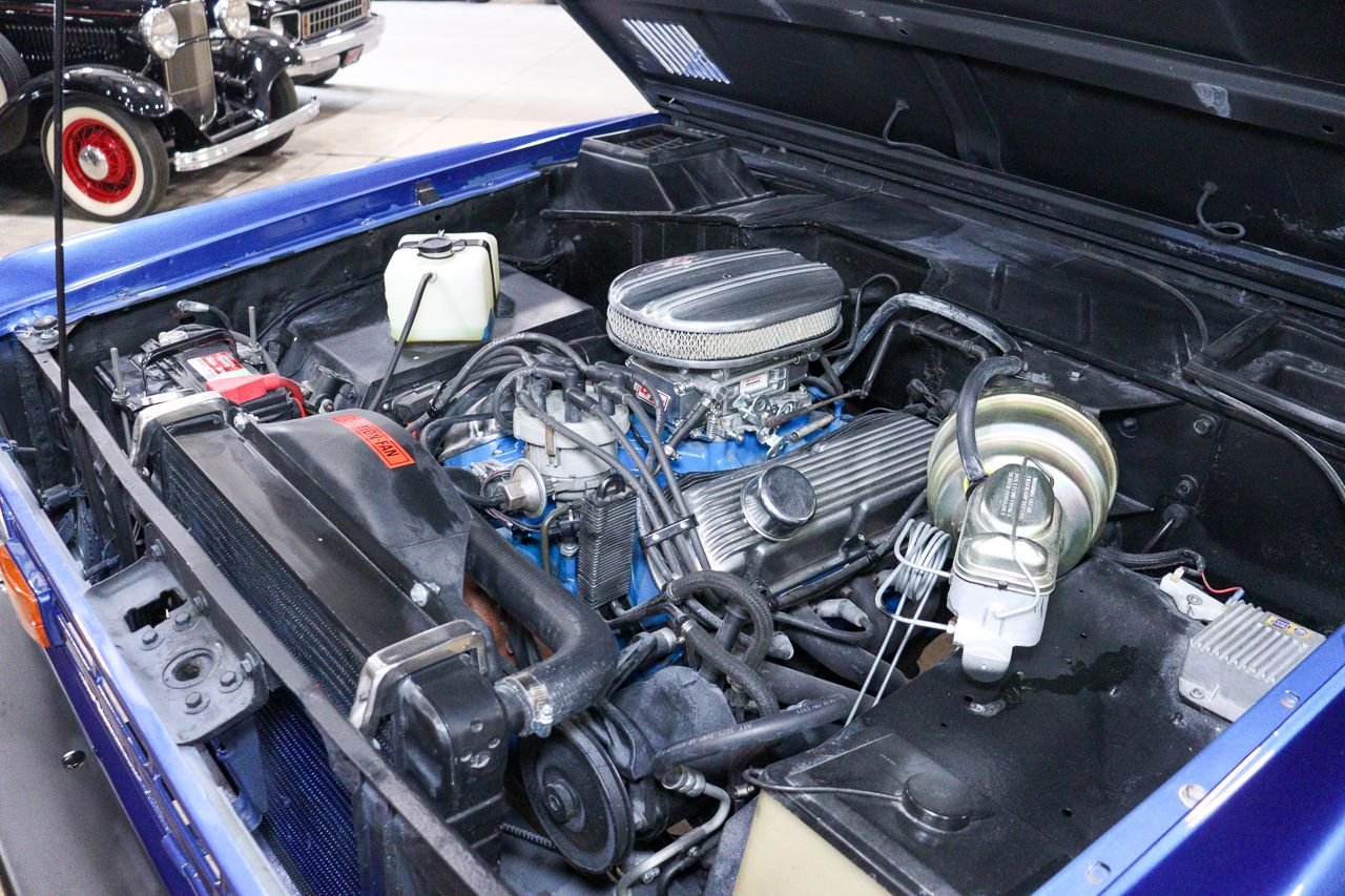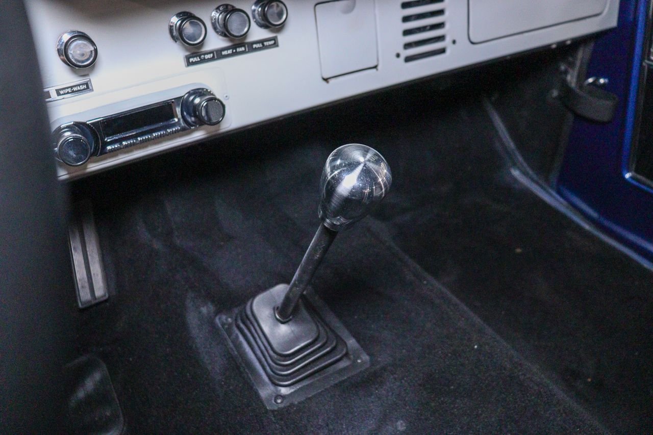 1974 Ford Bronco in excellent condition, boasting a powerful V8 motor and smooth automatic transmission. This classic SUV has undergone a minor restoration, including a fresh blue metallic paint job that gleams in the sunlight. The interior is a tasteful black and white houndstooth design, adding a touch of vintage charm to the vehicle.