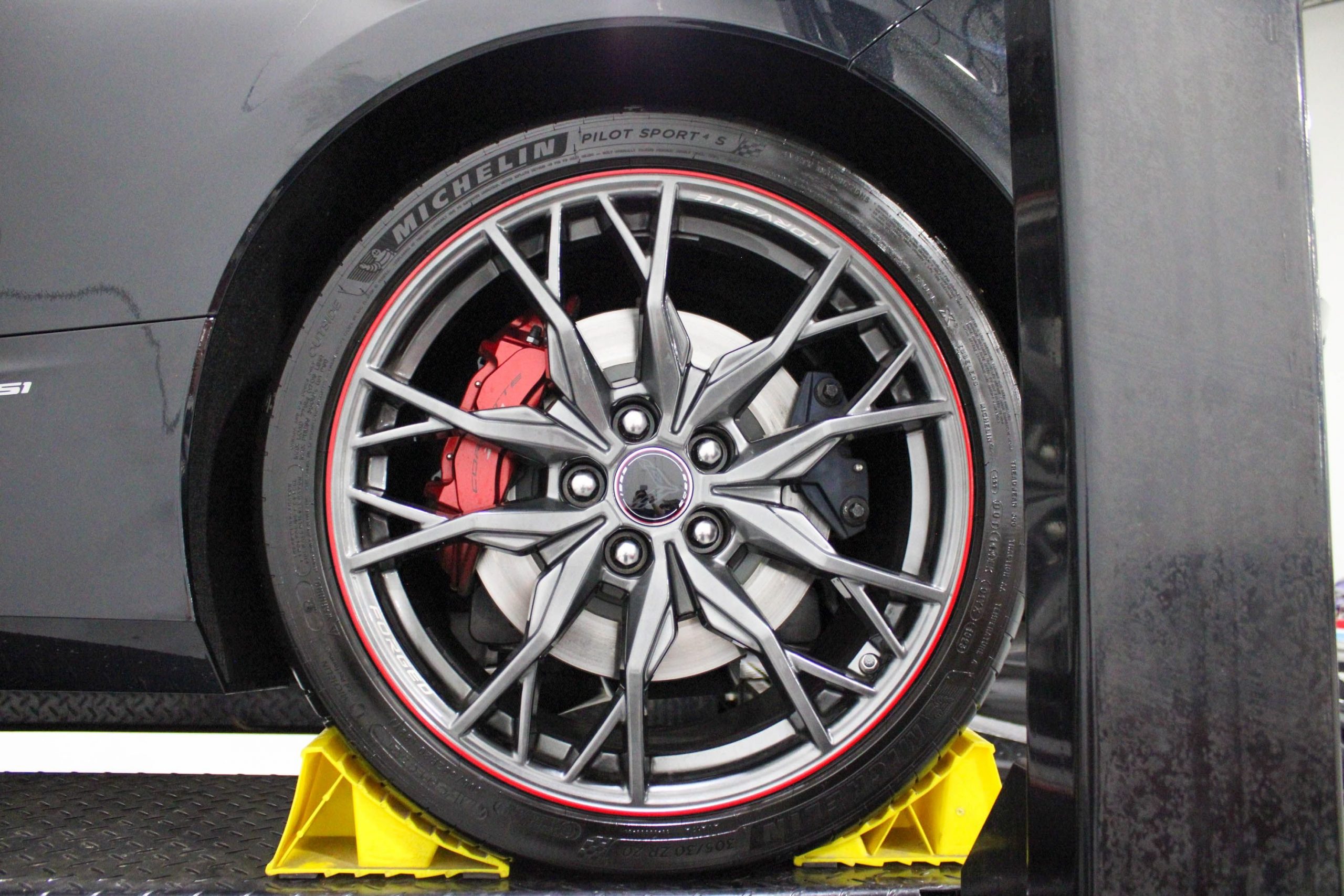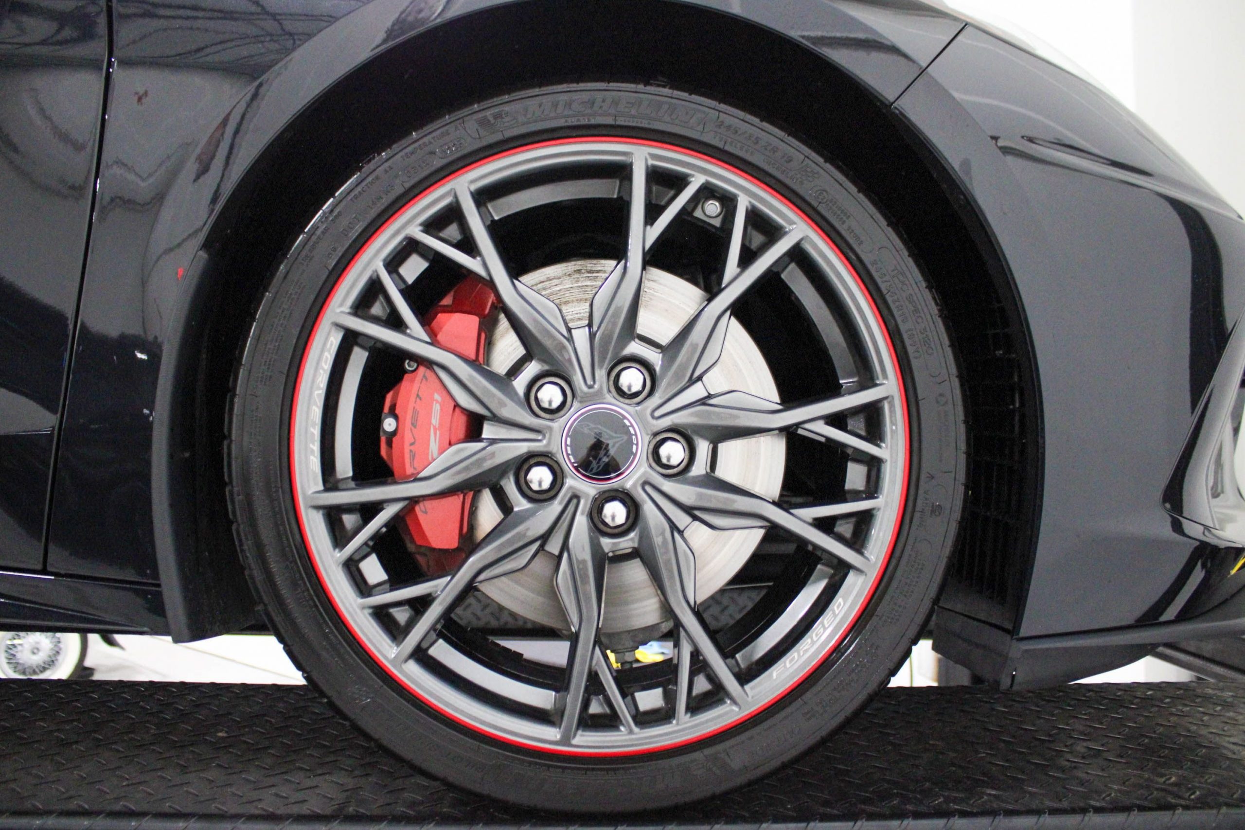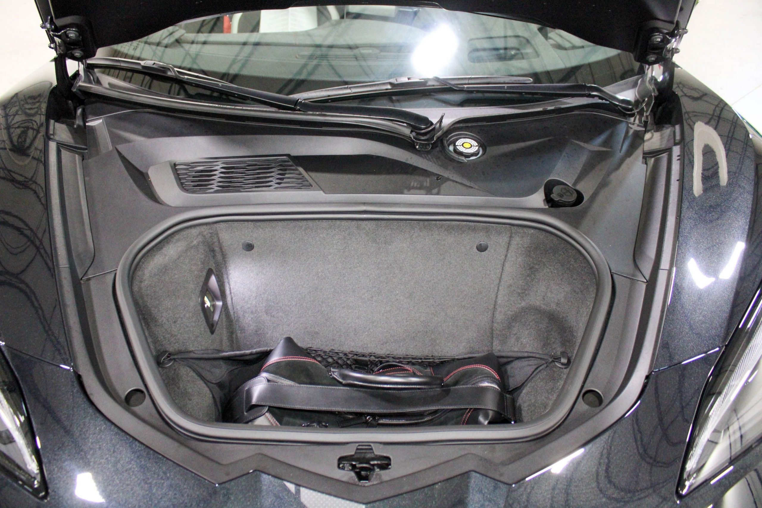 Adding to its exclusivity, this Stingray features 20-spoke Midnight Gray forged aluminum wheels with a bold Red stripe, specially designed for the 70th Anniversary Edition. It also comes with the original 70th Anniversary Corvette travel bags, a stylish and functional complement to the car’s upscale design.