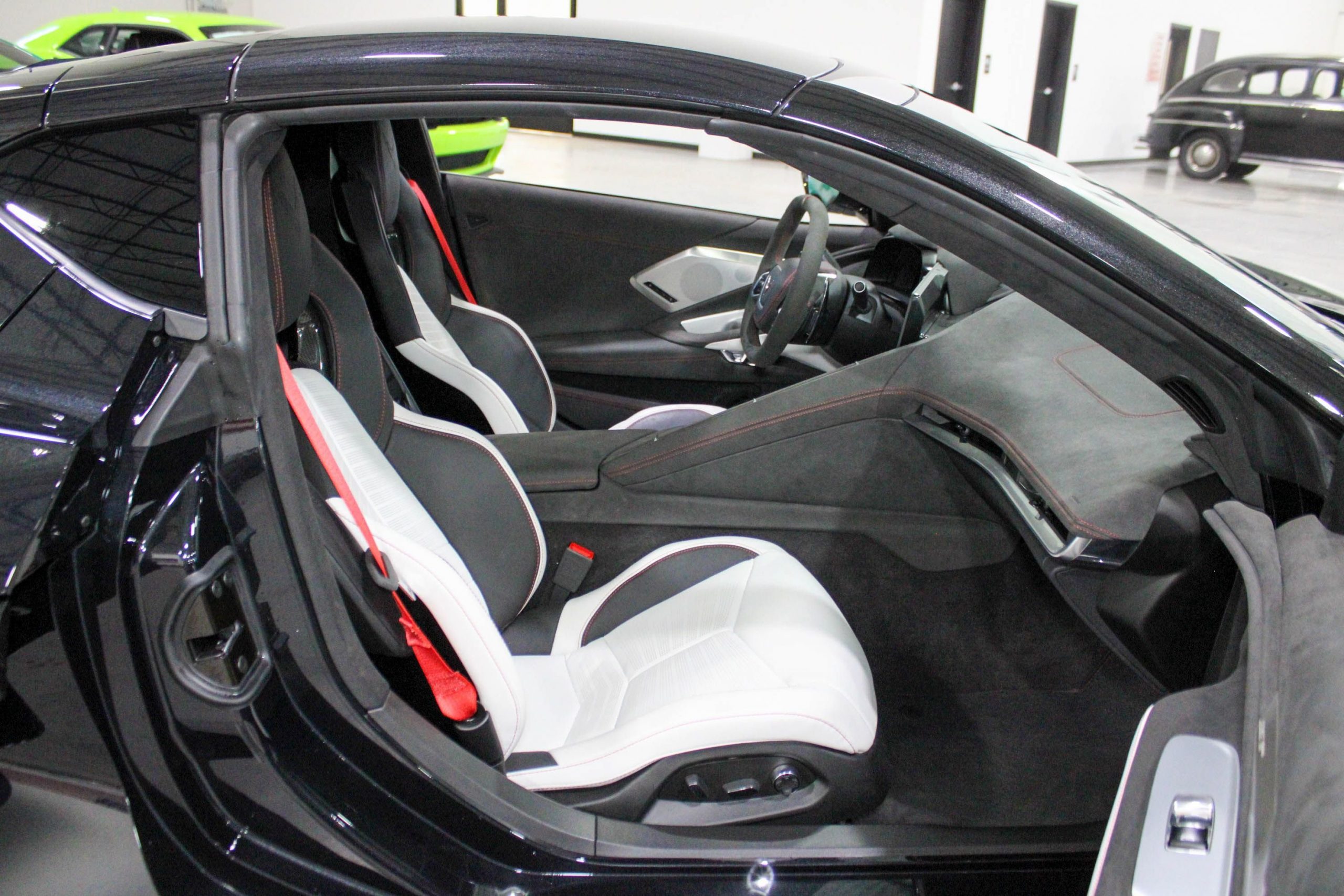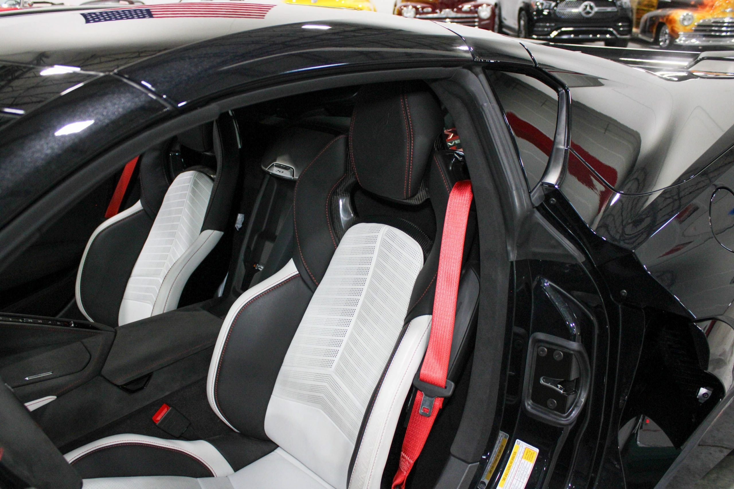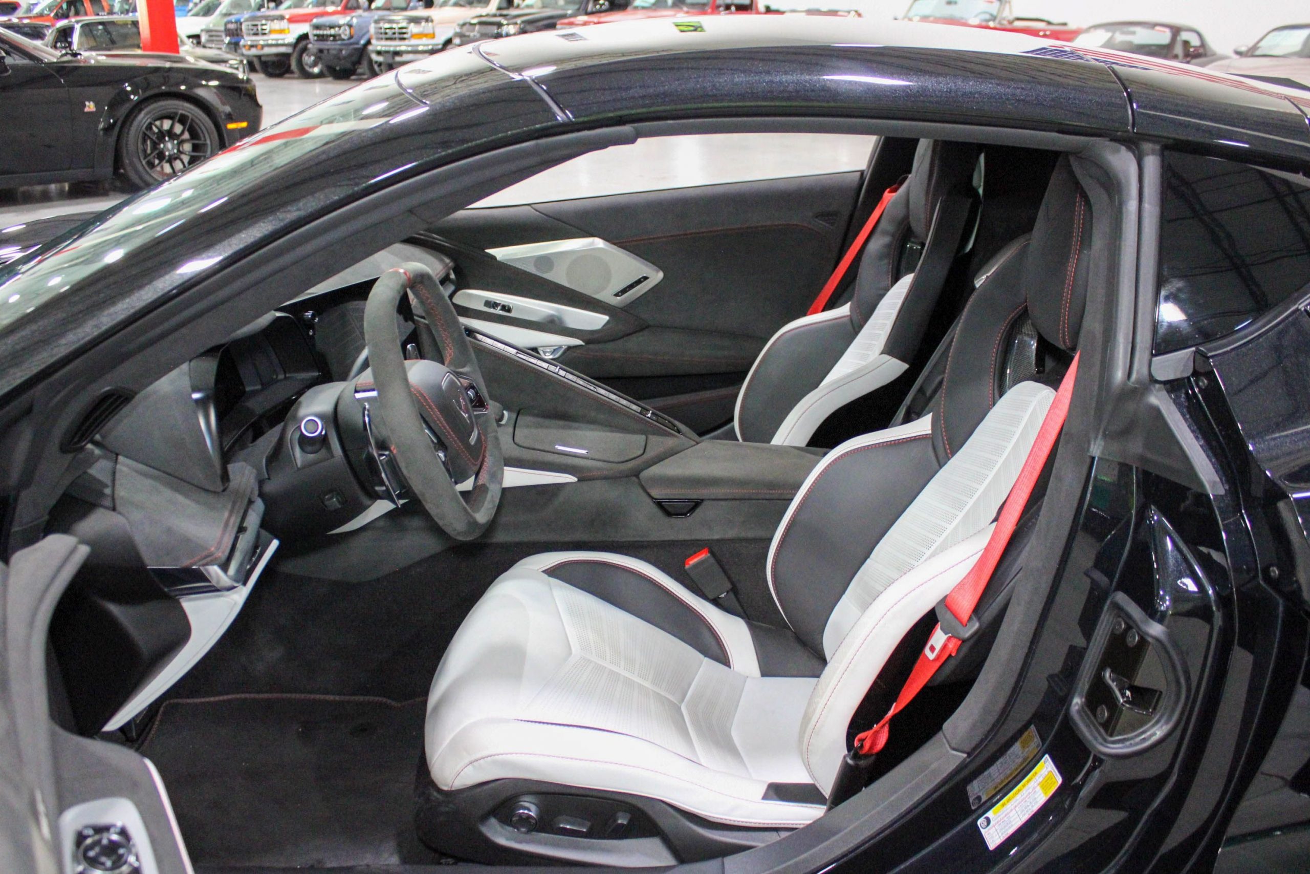 Inside, the cabin is appointed with the Ceramic White leather interior, elegantly accented by Red stitching and trim, giving a sophisticated yet performance-inspired feel. The 70th Anniversary branding is tastefully integrated throughout the vehicle, from the seat embroidery to the unique badging, ensuring this Corvette stands out as a true collector’s model.